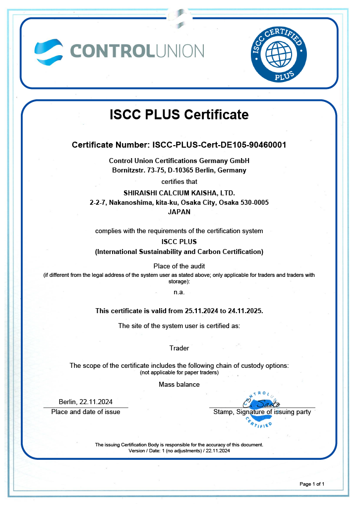 白石集团大阪总部已于2024年11月25日通过ISCC PLUS认证,Shiraishi Calcium (Singapore) Pte. Ltd.亦于2025年3月7日成功获得该项认证。