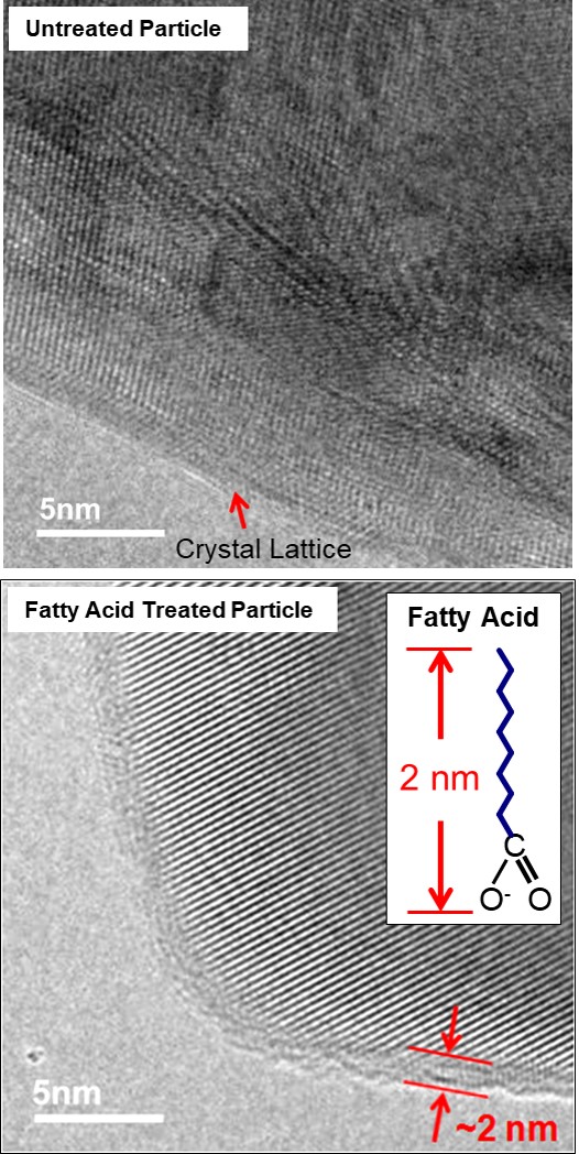 图2.未处理产品和脂肪酸处理产品的粒子表面的透射电子显微镜(TEM)图像。