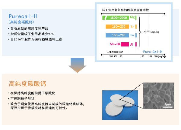 人碳酸钙有望在人工骨填充材料等生命科学领域、陶瓷电容等电子领域、闪烁剂等光学领域等诸多领域得到应用。我们运用至今为止在各种领域中培养起来的技术,努力向前所未有的新领域不断发起挑战。 具体地,我们致力于开发通过独特方法进行提纯处理的高纯度钙产品群、制备在全世界范围内也前例不多的碳酸钙烧结体、研究用作骨填充材料和细胞载体的可能性、向碳酸钙的新领域发起挑战。