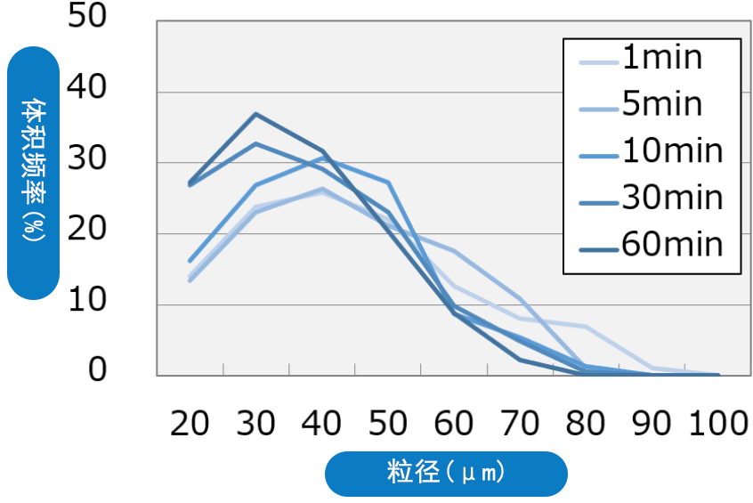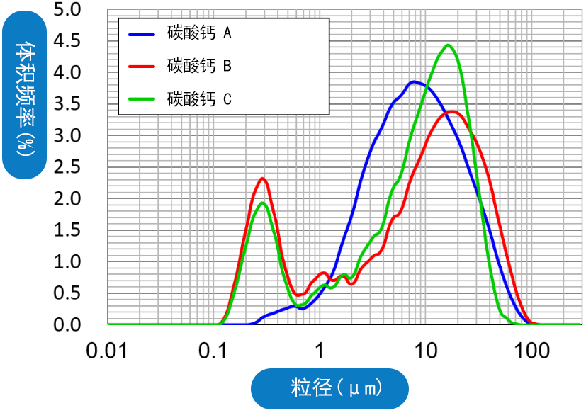 本示例中,我们制作了添加不同表面处理的碳酸钙的增塑剂(DINP)分散体,并使用激光衍射散射法测量了基质中的粒径分布,结果如右图所示。由此可见,从初级粒子(约100nm)到100μm以上的凝集体,我们都能定量测量到基质中的填料的分散状态。