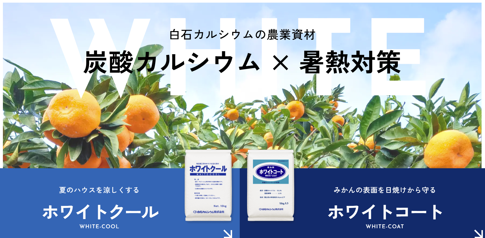 自然由来の炭酸カルシウムを活かした「ホワイトクール」や「ホワイトコート」を使い、ハウス内部の温度上昇やみかんの日焼け問題など、現場の課題を解決する製品情報・活用法を詳しくご紹介しています。